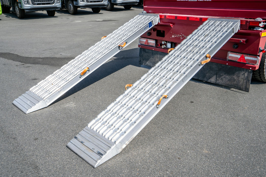 - Приставные аппарели – самое доступное решение при выборе трала, как правило, в транспортном положении уложены в специальные отсеки-пеналы под рамой.