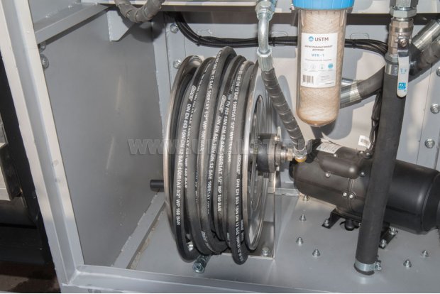 Система размыва илового осадка состоит из емкости для воды, водяного насоса высокого давления, размывочного рукава, распылительного пистолета с копьем. Для предотвращения аварийной ситуации (например, в случае прекращения подачи воды из емкости к насосу высокого давления) на ящике системы размыва илового осадка установлена кнопка останова двигателя, при нажатии на которую останавливается работа двигателя базового шасси Камаз, а, следовательно, прекращается работа всех приводов исполнительных механизмов. Кроме того, в ящике установлен воздушный отопитель, который обеспечивает обогрев водяного насоса и его коммуникаций при отрицательной температуре воздуха.