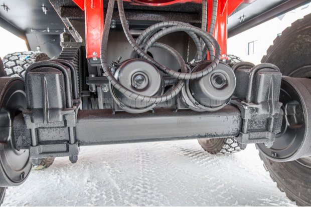 Полуприцеп-цистерна «УралСпецТранс» имеет рамную конструкцию – цистерна укладывается в ложементы рамы полуприцепа. Фиксация цистерны на ложементах при помощи стяжных лент, обеспечивает небольшую свободу цистерны при скручивании рамы, что дополнительно снижает нагрузку на саму цистерну. Такая конструкция имеет высокую прочность и надежность за счет того, что основная часть динамических нагрузок при движении приходится на раму. Стальная рама полуприцепа цистерны из сварного профиля имеет большой запас прочности, дополнительную жесткость конструкции придают вваренные усилители.