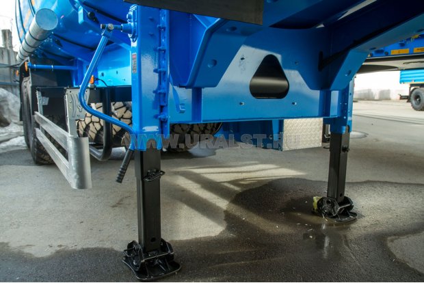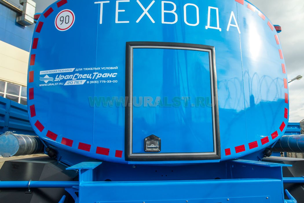 Полуприцеп-цистерна для технической воды имеет рамную конструкцию – цистерна укладывается в ложементы рамы полуприцепа. Фиксация цистерны на ложементах при помощи стяжных лент, обеспечивает небольшую свободу цистерны при скручивании рамы, что дополнительно снижает нагрузку на саму цистерну. Такая конструкция имеет высокую прочность и надежность за счет того, что основная часть динамических нагрузок при движении приходится на раму. Стальная рама полуприцепа цистерны из сварного профиля имеет большой запас прочности, дополнительную жесткость конструкции придают вваренные усилители.