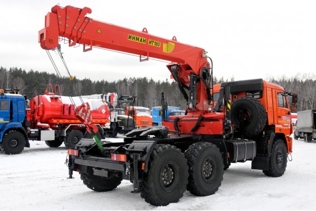 Седельный тягач Камаз 44108-RF предназначен для эксплуатации в составе автопоезда совместно с полуприцепом по всем видам дорог. На седельный тягач установлен кран-манипулятор ИТ-180 обеспечивающий проведение грузоподъемных работ весом до 7,2 тонн.