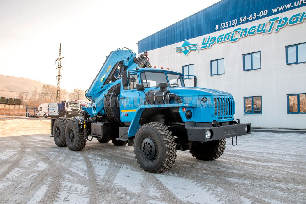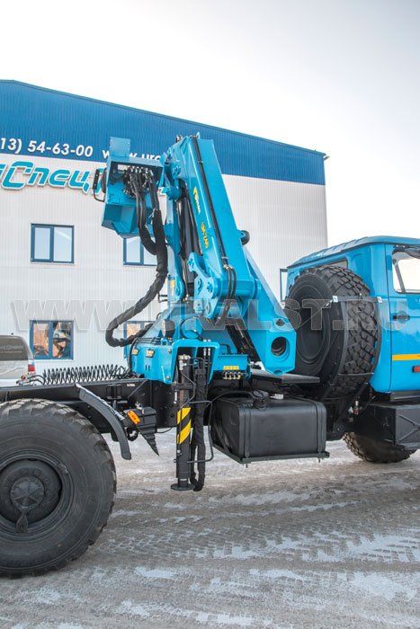 Седельный тягач Урал УСТ-5453 предназначен для эксплуатации с полуприцепом по всем видам дорог. На седельный тягач установлен кран-манипулятор ИМ-240-04, обеспечивающий проведение грузоподъемных работ весом до 7 тонн.