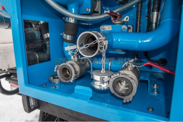 Автоцистерна оснащена передней поливомоечной рейкой, и двумя дополнительными шаровыми кранами в заднем насосном отсеке с БРС под пожарный рукав ДУ-50.