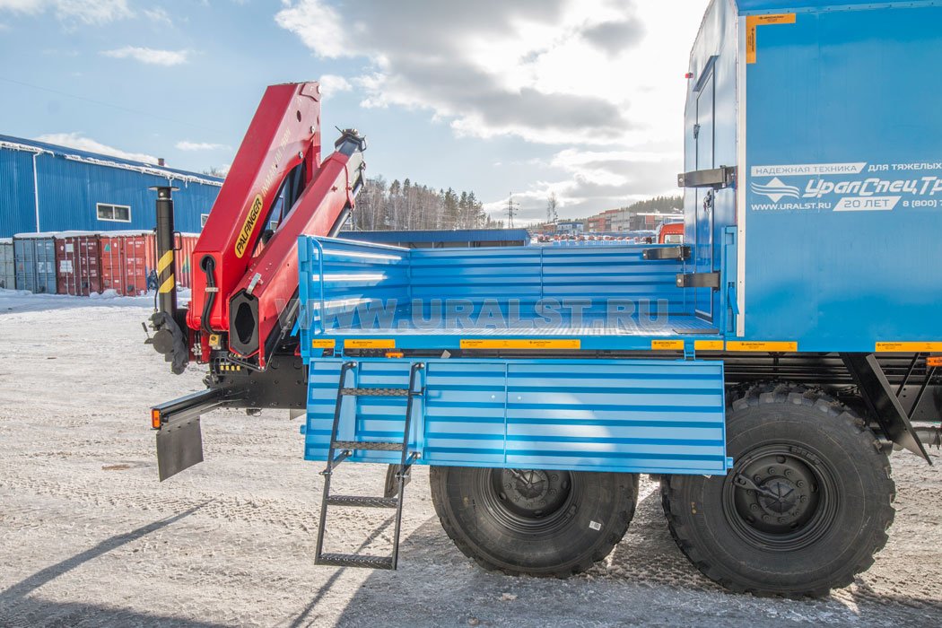 На заднем свесе автофургона установлен кран-манипулятор ИМ-150N, который позволяет проводить грузоподъемные работы весом до 6,1 тонн.