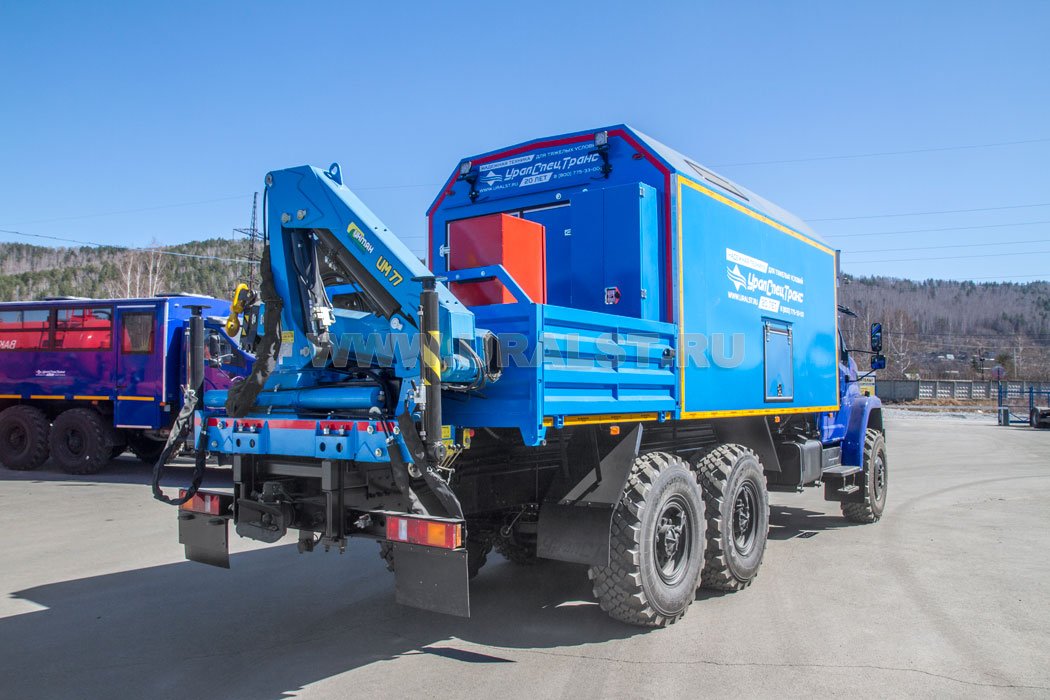 Передвижная авторемонтная мастерская (ПАРМ) УСТ-5453 с КМУ ИМ-77 на шасси Урал NEXT 4320-72Е5Г38 может быть применена для выполнения широкого перечня работ по ремонту и восстановлению техники в условиях отсутствия стационарных ремонтных баз, а также для проведения планового технического обслуживания различной техники.