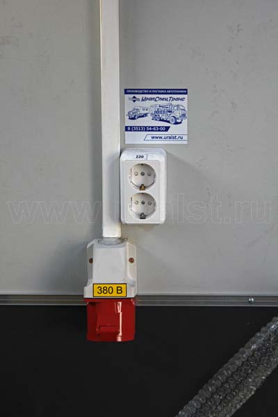 Фургон оборудован розетками для подключения потребителей 220 и 380V. Для работы в темное время суток все рабочие места фургона оборудованы плафонами освещения.